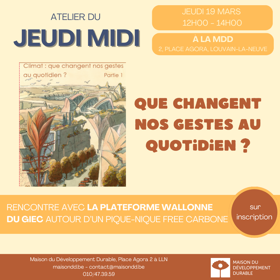 Le jeudi 19/03, la MDD accueille la Plateforme wallonne pour le GIEC (Groupe d’experts Intergouvernemental sur l’Évolution du Climat) pour échanger autour de la question de l’impact de nos gestes au quotidien sur le climat 🌍. La cellule Manger Demain sera également présente pour discuter avec vous de notre alimentation 🥕 👉 Quelques petites informations…