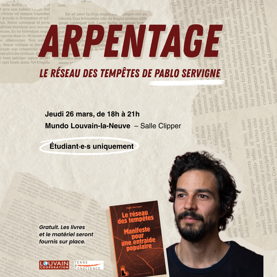 ✨ Bonus exclusif : l’arpentage sera suivi d’un atelier en petit comité avec Pablo Servigne, le 7 avril sur le temps de midi à Louvain-la-Neuve. Et le soir même, une conférence grand public à 18h !