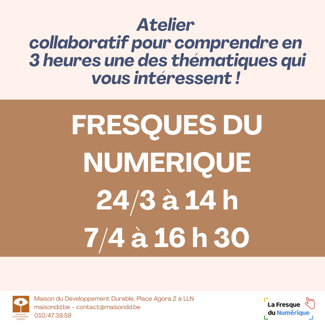 La Fresque du Numérique est un atelier ludique et collaboratif avec une pédagogie similaire à celle de la Fresque du Climat. Le but de ce « serious game » est de sensibiliser et former les participant·es aux enjeux environnementaux du numérique.